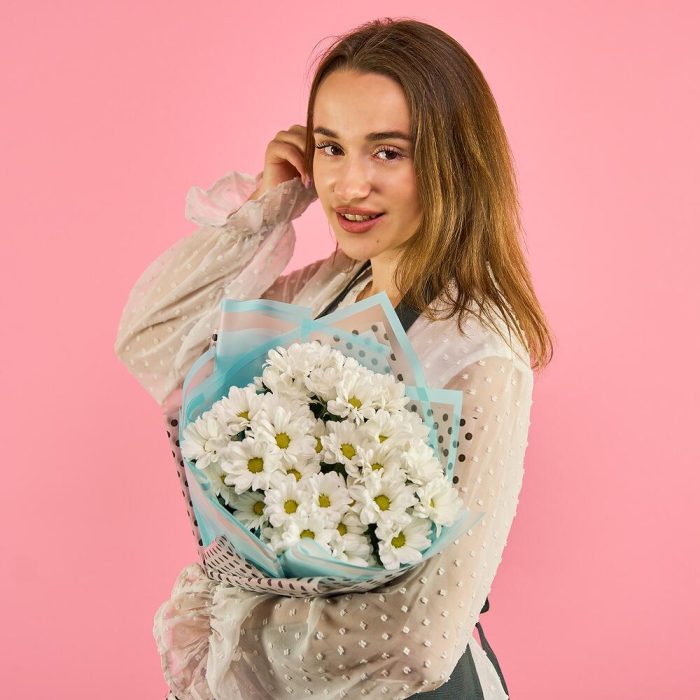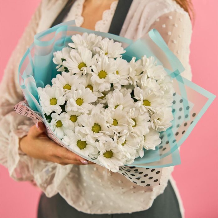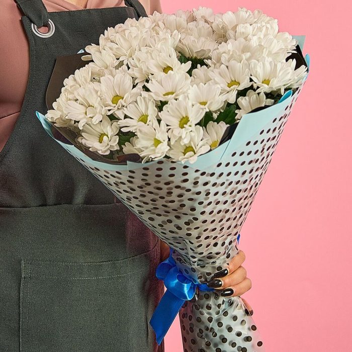 хризантема кустовая (белый) – 15 шт.пленка цветная – 1 шт.лента атласная (синий) – 1 шт.