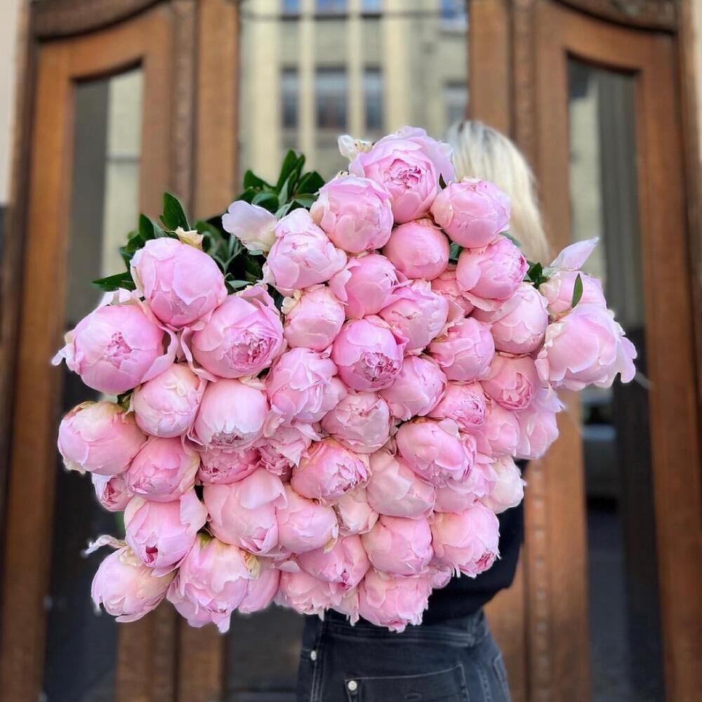 Пион розовый – 51 шт.Лента атласная – 2 шт.Открыточка с вашими пожеланиями – 1 шт.хорошее настроение – 100 шт.инструкция по уходу за цветами – 1 шт.коробка переноска – 1 шт.Кризал – 1 шт.