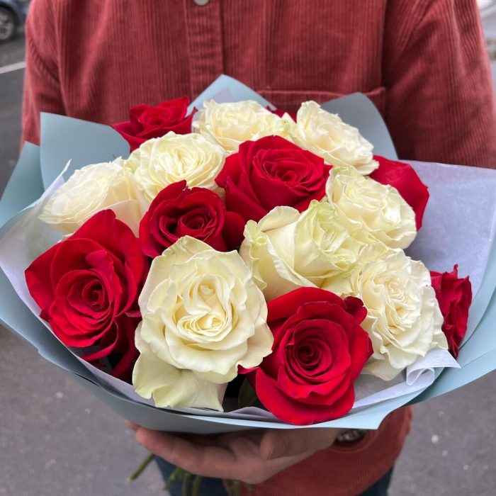 роза красная фридом – 8 шт.Роза белая мондиаль – 7 шт.Упаковка дизайнерская – 1 шт.