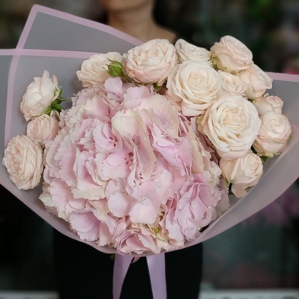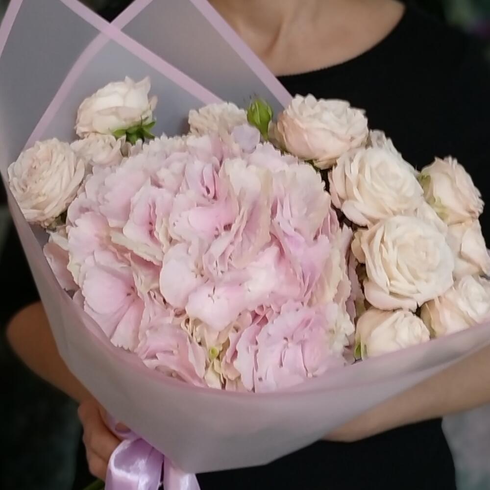 Гортензия – 1 шт.Роза кустовая – 3 шт.Оформление – 1 шт.