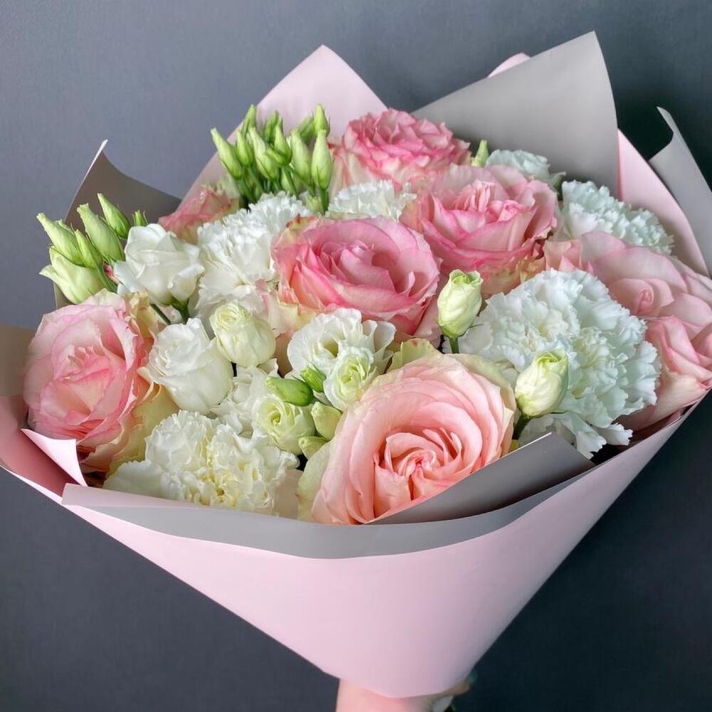 Роза Эквадор – 7 шт.Лизиантус – 4 шт.Диантус сортовой – 5 шт.Упаковка дизайнерская – 3 шт.Лента атласная – 1 шт.